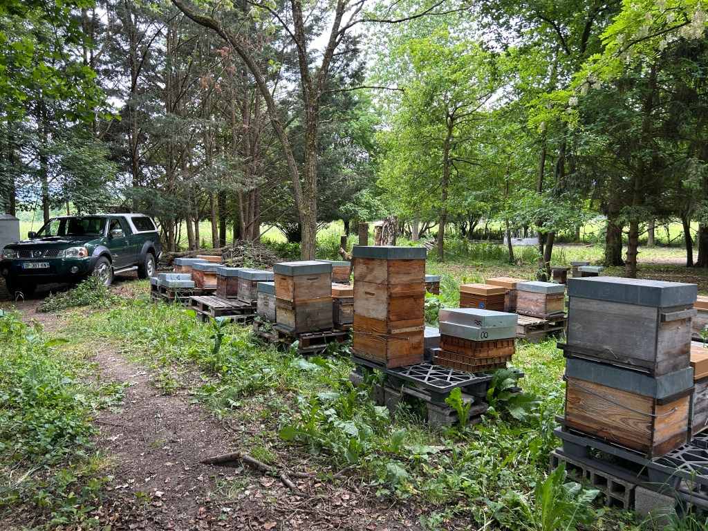 Une petite quantité de miel est récoltée sur les colonies les plus dynamiques, nectars de Robinier (Faux-acacia) en Juin, Ronce et forêt en Juillet et Aout. Le miel est mis en pots à la maison et les indications sur l’étiquette mentionnent le lieu de récolte, la date d’extraction, le taux d’eau et la date limite d’utilisation optimale.